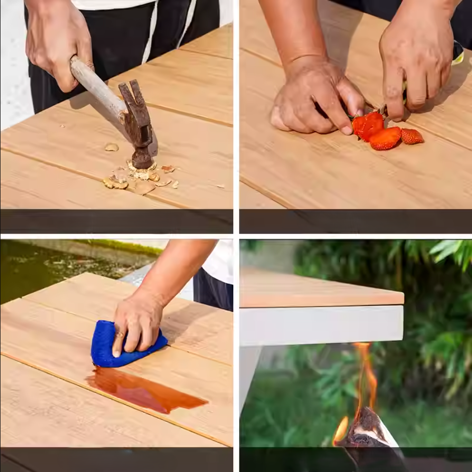 Toàn bộ sản phẩm đều sử dụng hợp kim nhôm đúc cao cấp, được xử lý bề mặt kỹ lưỡng, chống ăn mòn và bền bỉ với thời tiết. Mặt bàn và các nan ghế được làm từ gỗ nhựa composite cao cấp, có khả năng chống nước, không cong vênh, không bạc màu sau thời gian dài sử dụng ngoài trời.