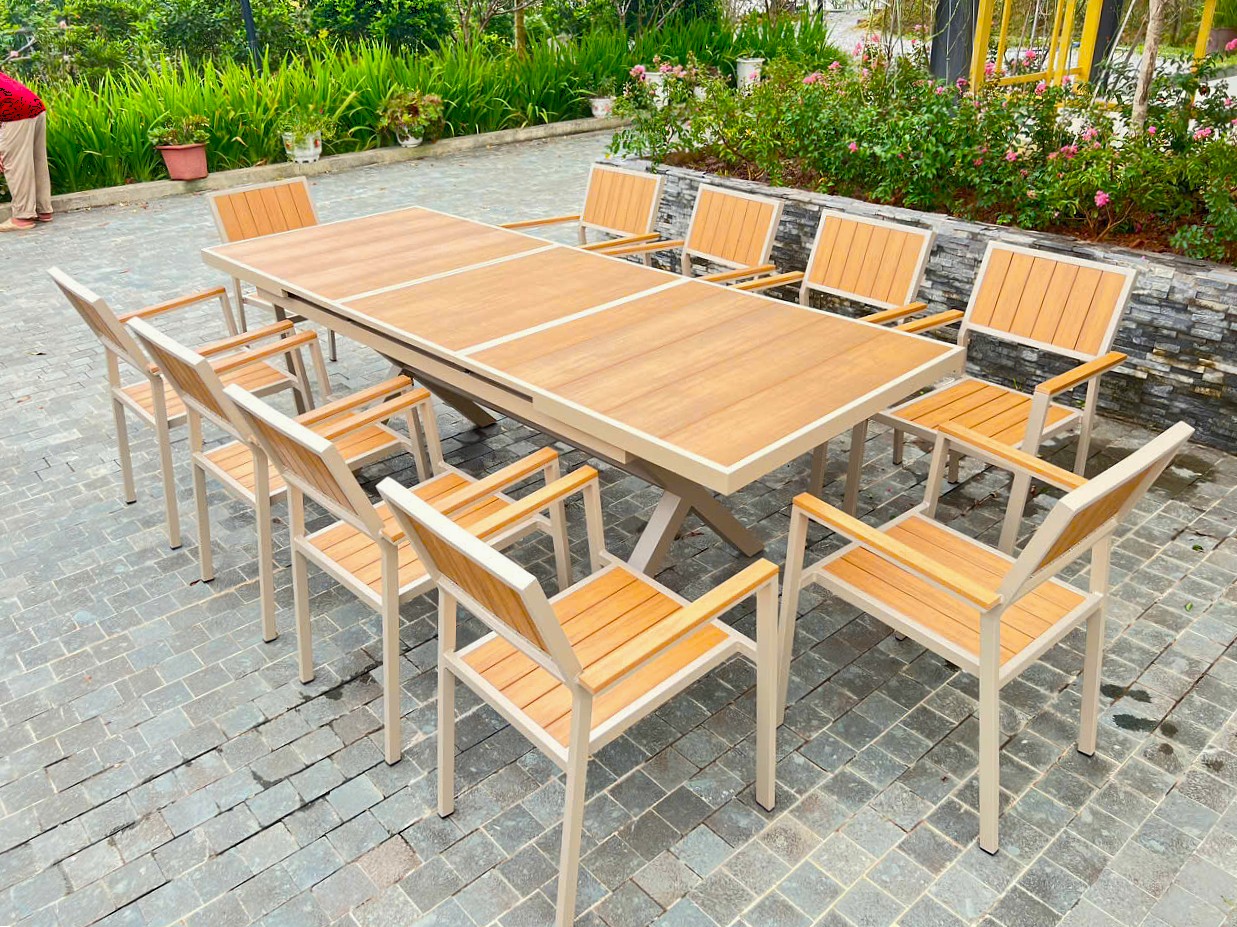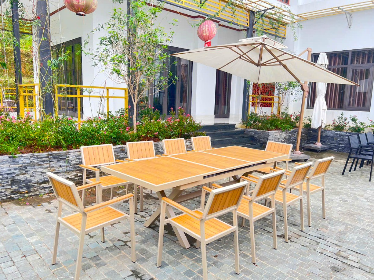 Không chỉ phù hợp cho không gian sân vườn, bộ bàn ghế này còn có thể sử dụng hiệu quả ở khu vực ban công lớn, sân thượng, hoặc thậm chí làm bàn ăn trong nhà – nhờ tính thẩm mỹ và khả năng thay đổi kích thước linh hoạt.