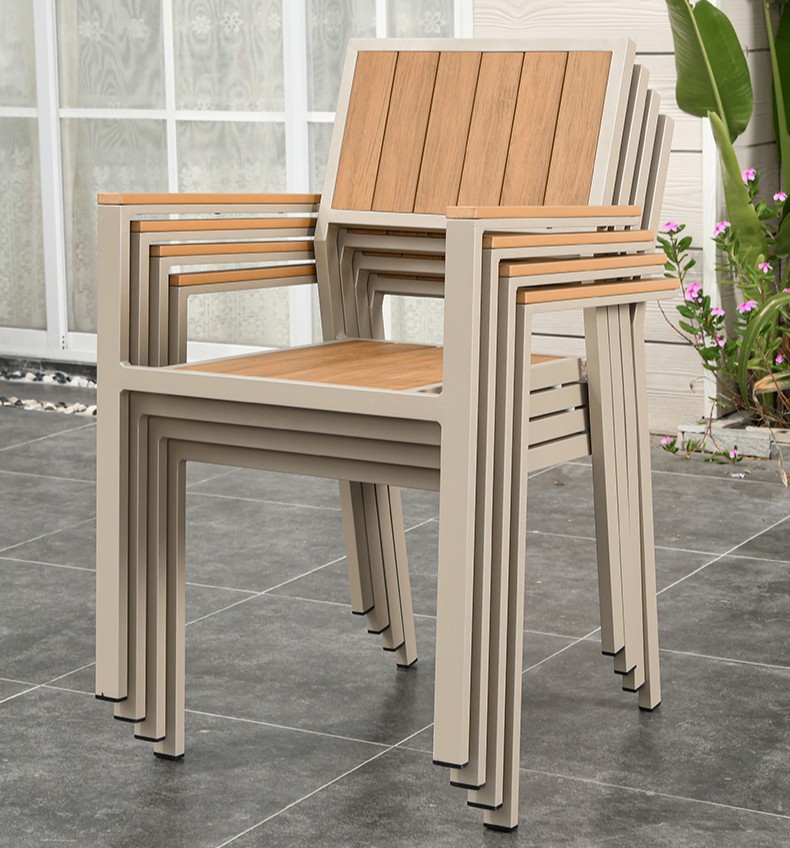 Bộ bàn ghế được chọn với khung nhôm sơn tĩnh điện màu kem nhạt, kết hợp hoàn hảo với mặt bàn, mặt ngồi và lưng ghế màu gỗ sáng. Sự kết hợp màu sắc nhẹ nhàng này mang đến cảm giác ấm áp, tự nhiên, thanh lịch và vô cùng sang trọng